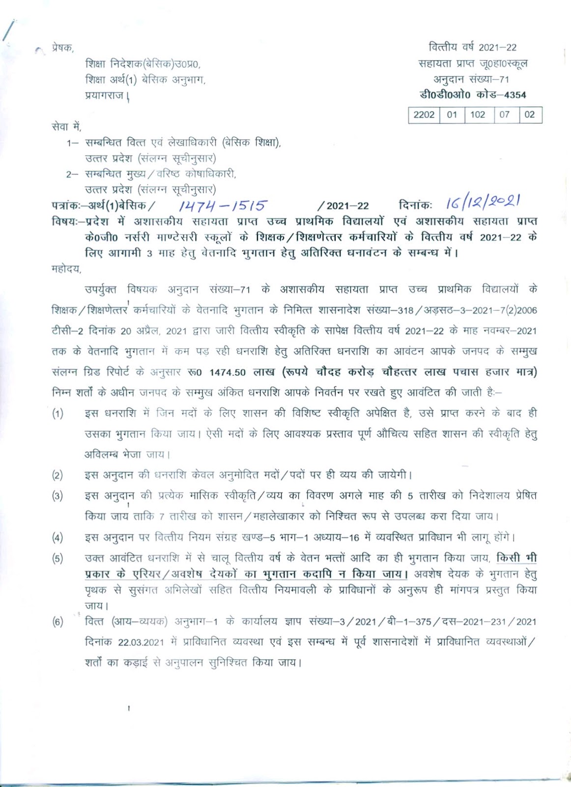 प्रदेश में अशासकीय सहायता प्राप्त उच्च प्राथमिक विद्यालयों एवं अशासकीय सहायता प्राप्त के०जी० नर्सरी माण्टेसरी स्कूलों के शिक्षक / शिक्षणेत्तर कर्मचारियों के वित्तीय वर्ष 2021-22 के लिए आगामी 3 माह हेतु वेतनादि भुगतान हेतु अतिरिक्त घनावंटन के सम्बन्ध में।