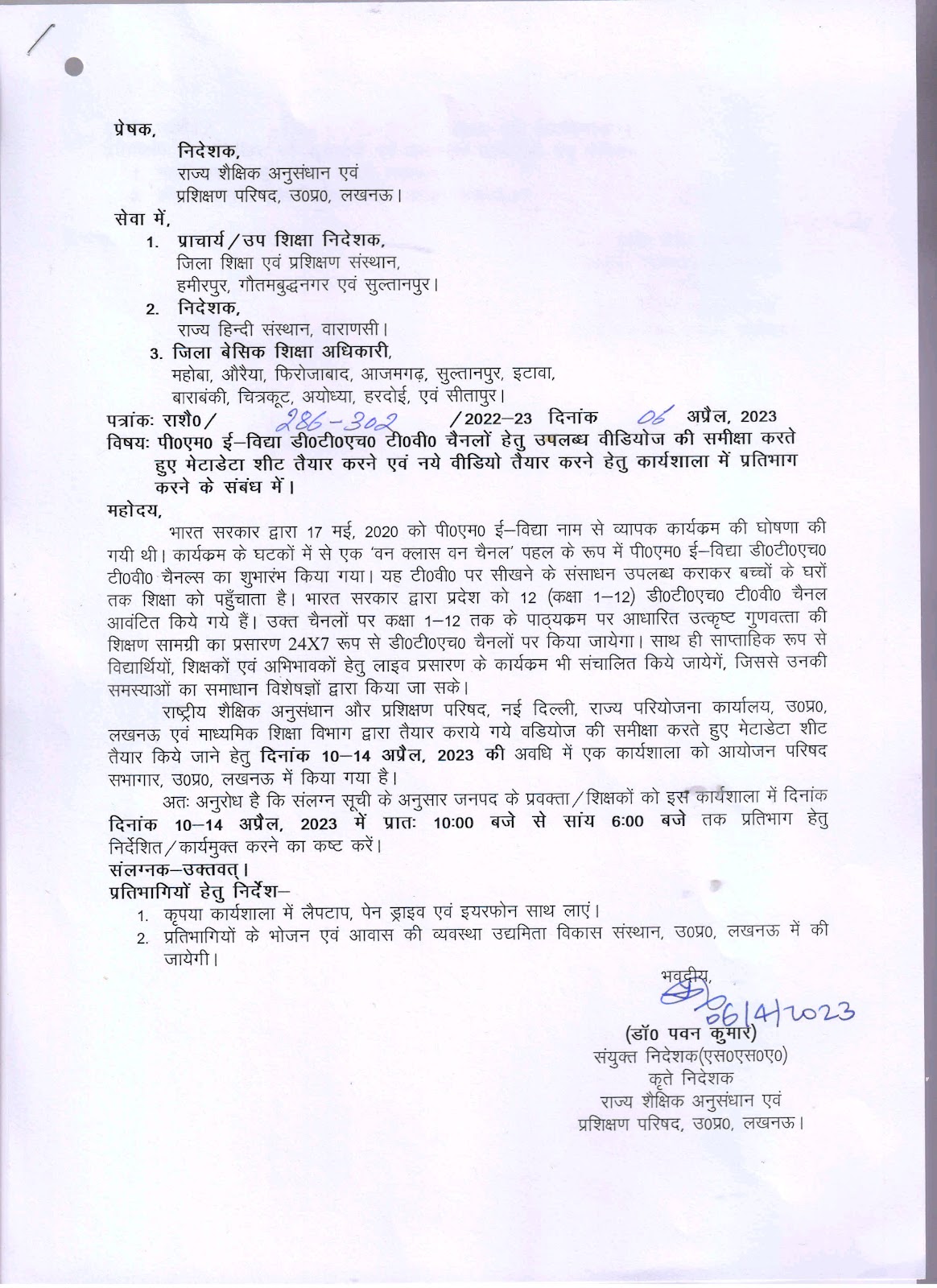 पी०एम० ई-विद्या डी०टी०एच० टी०वी० चैनलों हेतु उपलब्ध वीडियोज की समीक्षा करते हुए मेटाडेटा शीट तैयार करने एवं नये वीडियो तैयार करने हेतु कार्यशाला में प्रतिभाग करने के संबंध में ।