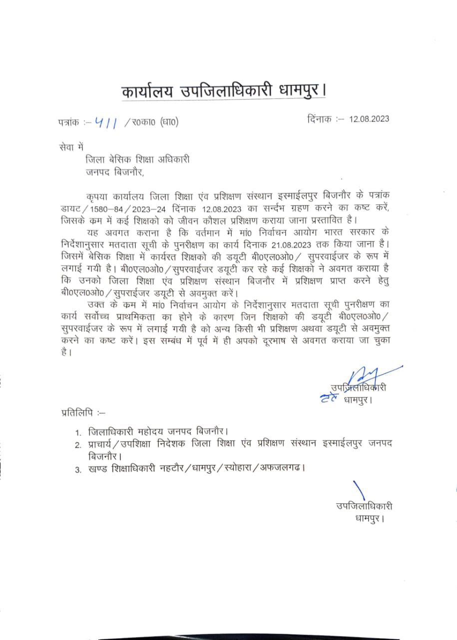 मतदाता पुनरीक्षण कार्य में लगे बीएलओ शिक्षकों को अन्य कार्य व ड्यूटी से अब मुक्त रखने के संबंध में