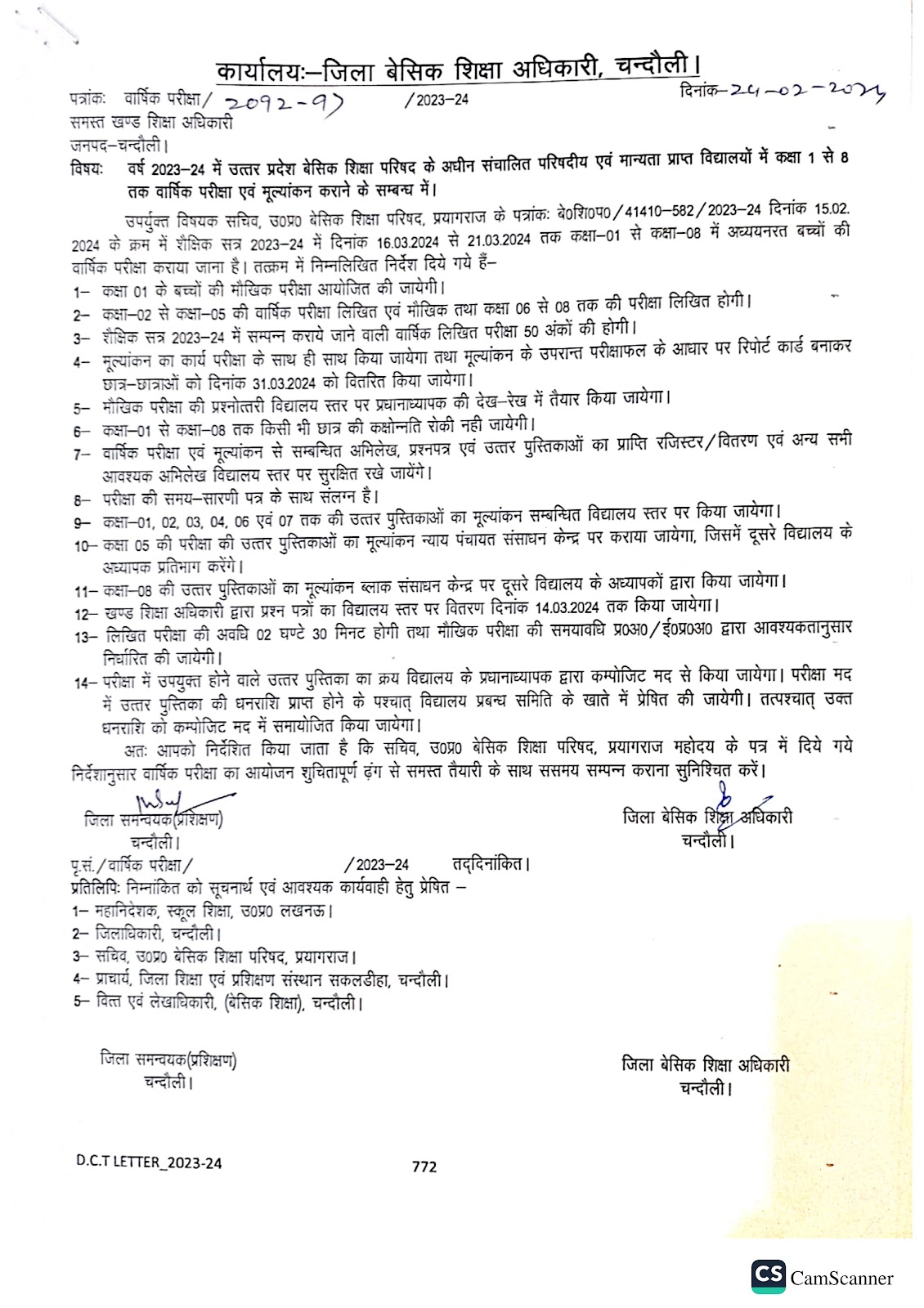 वर्ष 2023-24 में उत्तर प्रदेश बेसिक शिक्षा परिषद के अधीन संचालित परिषदीय एवं मान्यता प्राप्त विद्यालयों में कक्षा 1 से 8 तक वार्षिक परीक्षा एवं मूल्यांकन कराने के सम्बन्ध में