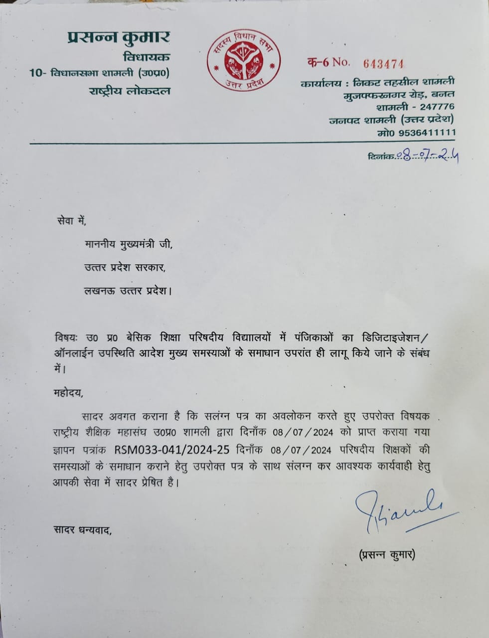 शामली विधायक माननीय प्रसन्न चौधरी जी ने ऑनलाइन हाजिरी के विरोध में दिए गए राष्ट्रीय शैक्षिक महासंघ के ज्ञापन को मुख्यमंत्री कार्यालय में आवश्यक कार्यवाही हेतु प्रेषित किया ।
