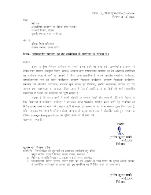 ग्रीष्मकालीन रामायण एवं वेद कार्यशाला के आयोजन के सम्बन्ध में।